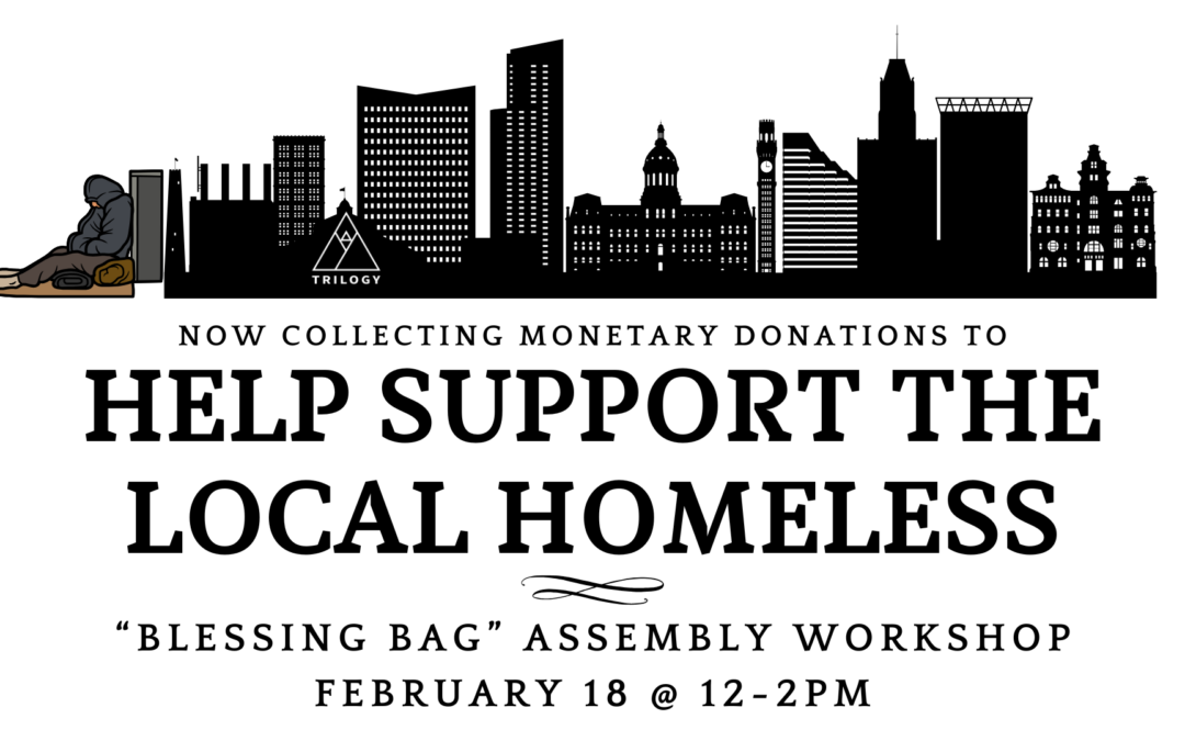 Join us in the Trilogy lobby on February 18 from 12-2pm to assemble Blessing Bags for the Baltimore City Homeless.